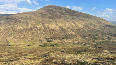 This is where the day got a bit harder. There is clearly a rover track (jeep trail) to this point and you can see a switchback trail up to the summit of Gulvain (see map below) however our path completely stops at this point. (red arrow). Now on some OS maps you still see a single dashed line on the map, indicating a path. In these wetter areas you can't count on that still being a path you can follow on the ground. This became a very rough walk over ground that was very contoured and in some places had been washed completely into the river.